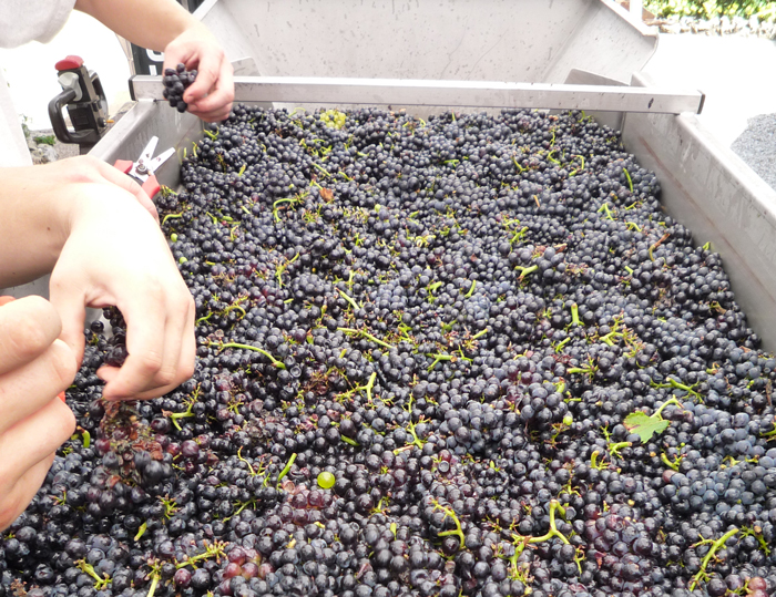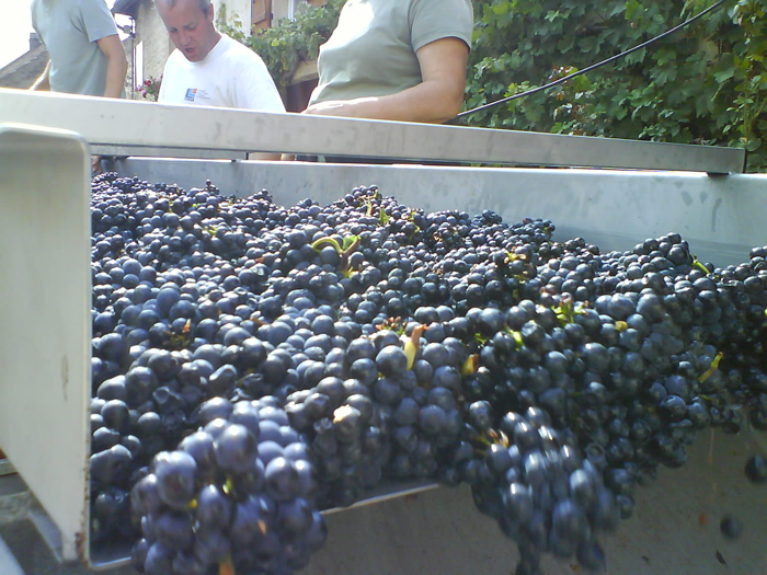 Les raisins sont transportés en petites caisses assez rapidement afin d'éviter l'écrasement des baies et le risque d'oxydation. A la cuverie, la vendange est totalement triée sur une table de tri vibrante et avec l'aide de six personnes, égrappée et foulée avant d'être mise en cuve où elle restera environ quinze jours. On pratique au départ une macération à froid (08°C) avec un remontage du jus par jour afin de libérer la couleur et aussi les premiers arômes de fruits.